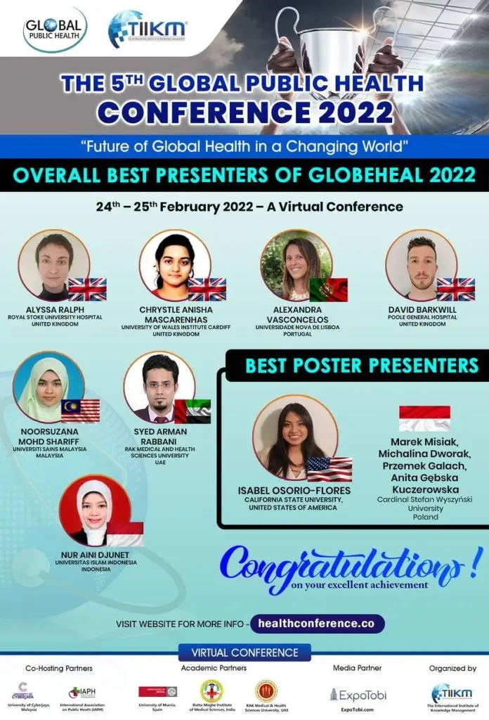 The 5th Global Public Health Conference 2022 (GLOBEHEAL 2022) was held from 24th – 25th of February in Virtual Platform under the theme “Future of Global Health in a Changing World.” The conference was organized by The International Institute of Knowledge Management (TIIKM), Sri Lanka and hosted by the International Association on Public Health (IAPH) with the University of Cyberjaya, Malaysia. Universidad De Murcia, Spain, RAK Medical & Health Sciences University, UAE, and Datta Meghe Institute of Medical Sciences, India collaborated with the GLOBEHEAL 2022 as the Academic Partners.